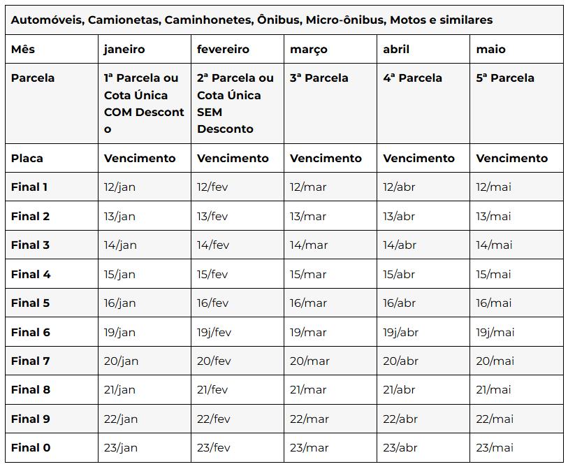 O pagamento segue o final da placa do veículo e pode ser feito à vista, com desconto de 3%, ou parcelado em até 5 vezes, de acordo com o valor do imposto devido.