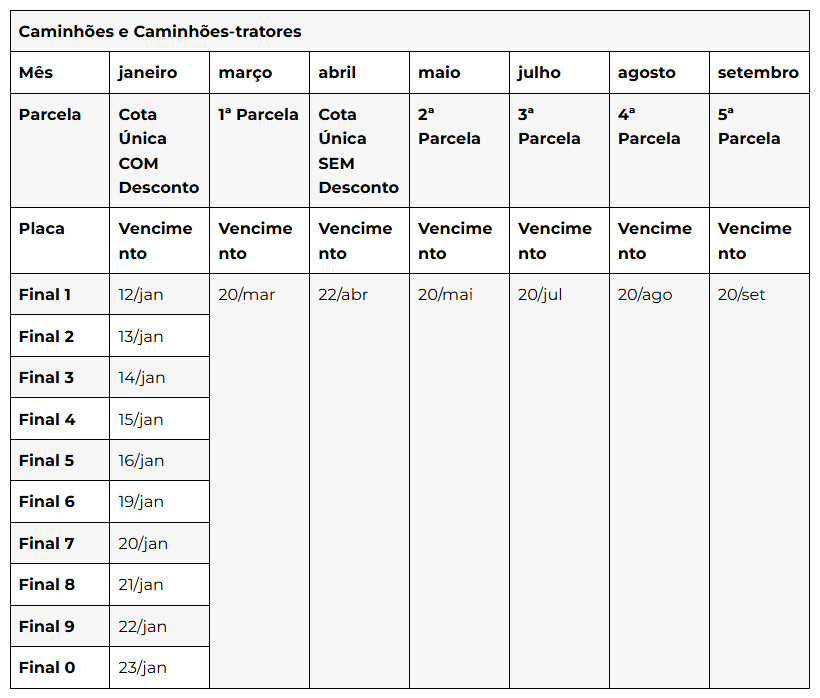 A tabela de pagamento para proprietários de veículos de carga é diferente. O pagamento pode ser feito, sem desconto, até 22 de abril, ou parcelado em até cinco vezes, com data fixada no dia 20 de cada mês.